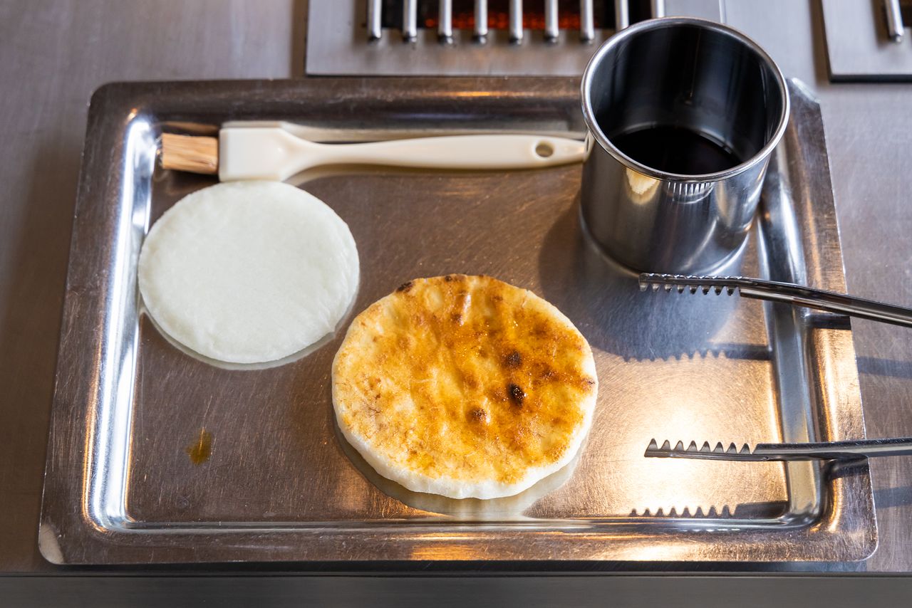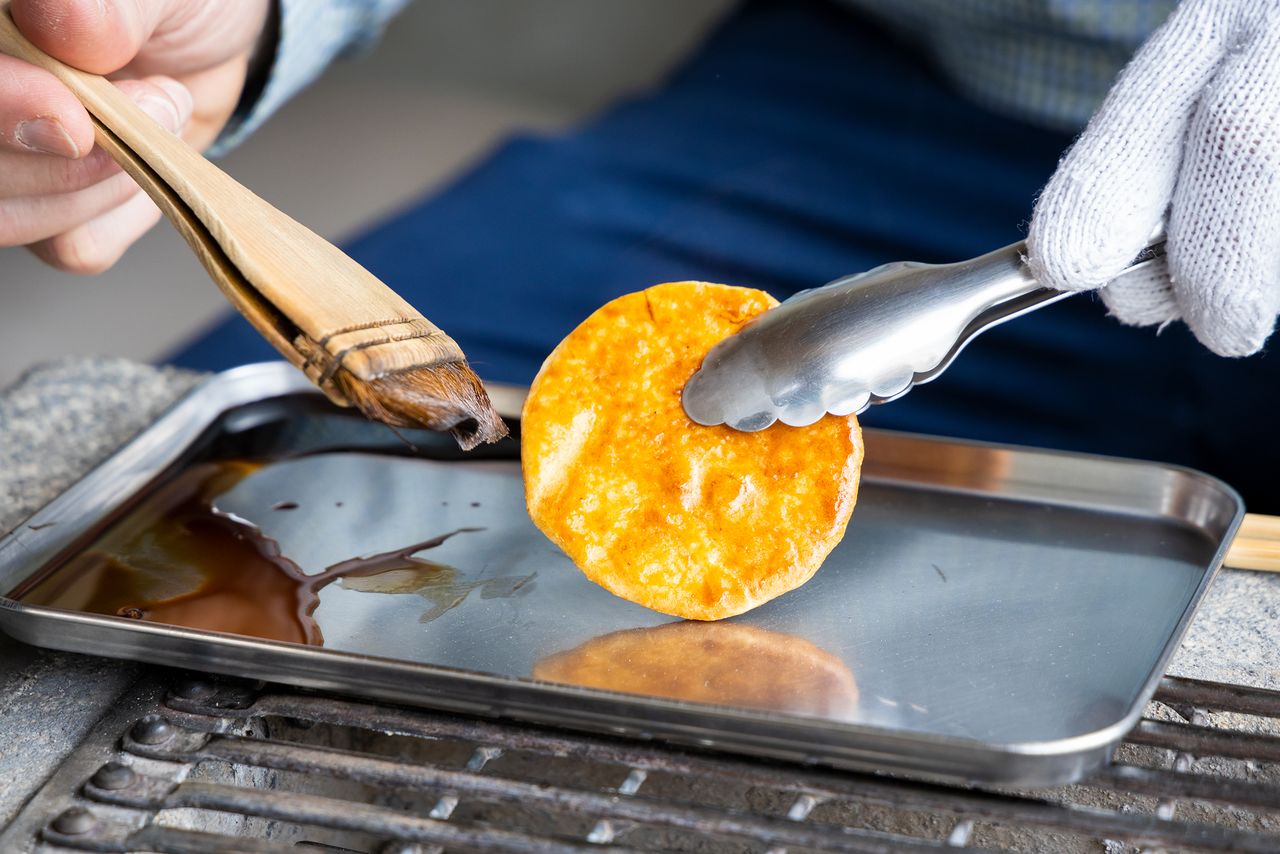 Como la salsa de soja de Noda tiene un gusto fuerte, se debe tener cuidado y no poner demasiada a la senbei.