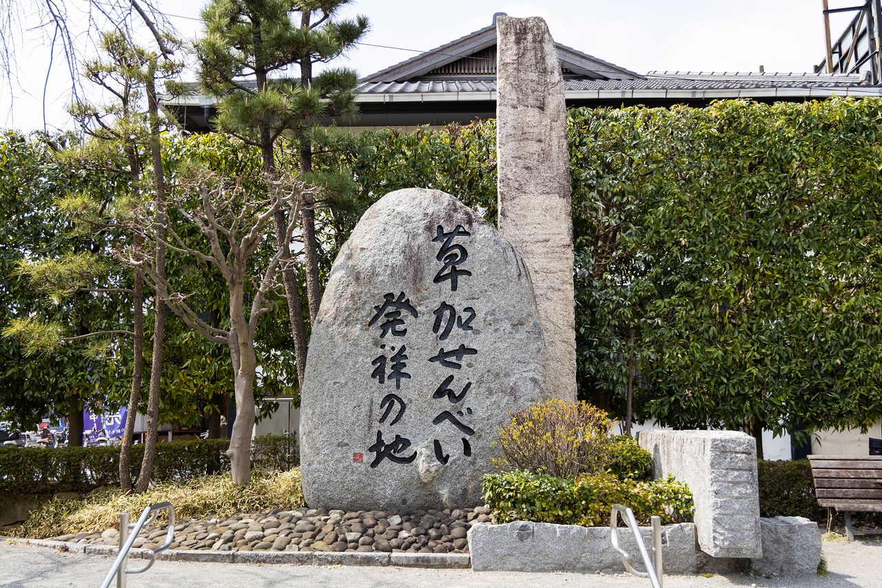 El monumento de piedra conmemorativo del lugar de origen de la Sōka Senbei en el parque Osen.