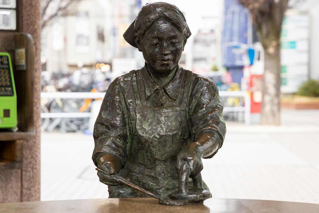 La estatua de Osen frente a la estación de Sōka. Ya que lleva un delantal y una blusa con cuello no parece tener relación con la historia del lugar de origen del Sōka Senbei.