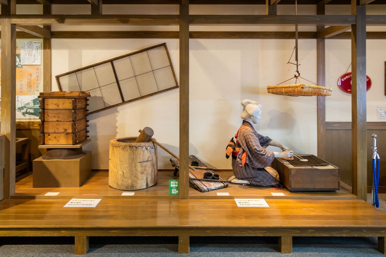En la sala de exposiciones de productos tradicionales Parisse hay una maqueta que ilustra cómo se preparaban las senbei en el periodo Edo.