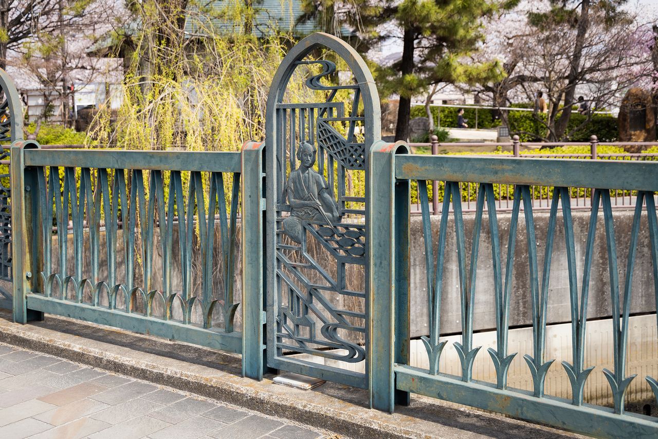 En el enrejado del puente que cruza el río Den’u, frente al parque Osen, hay una silueta de una persona preparando senbei.