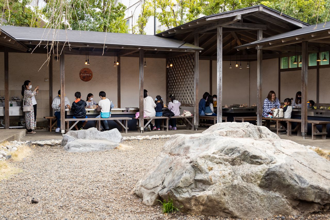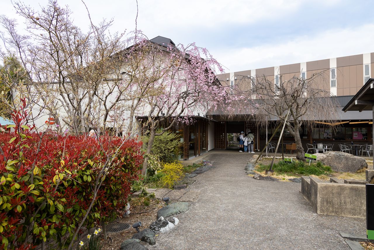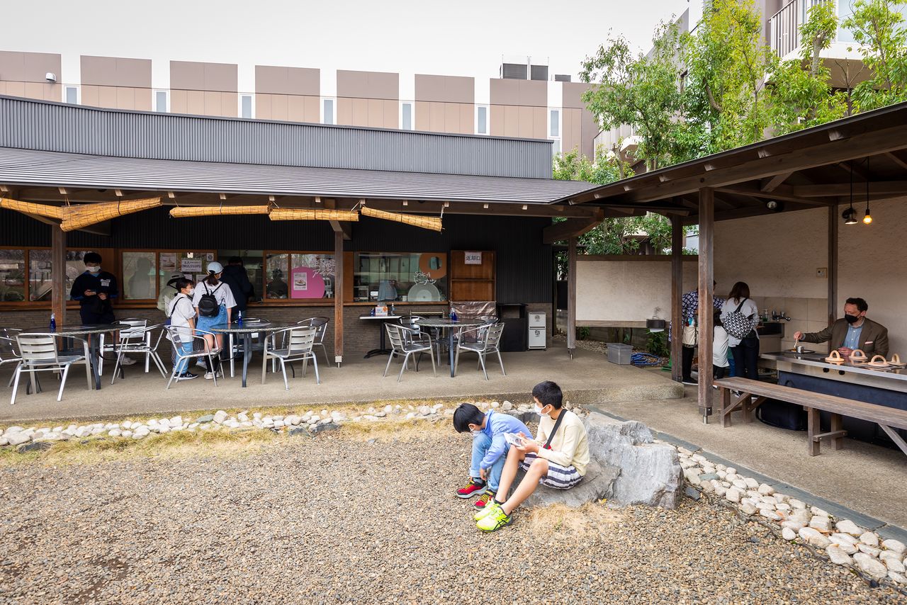 La cafetería en el jardín también es muy popular. Se puede disfrutar de platos exclusivos tales como el helado y el dónut sabor Sōka Senbei, los fideos udon con caldo de senbei, entre otros.