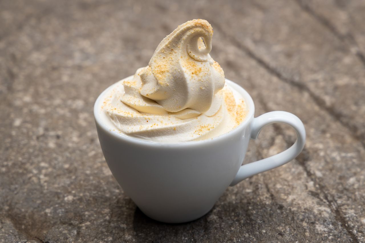 Helado espolvoreado con galleta Sōka Senbei molida. Su sabor es dulce y suave, con un toque salado y la galleta crujiente le da una textura especial.