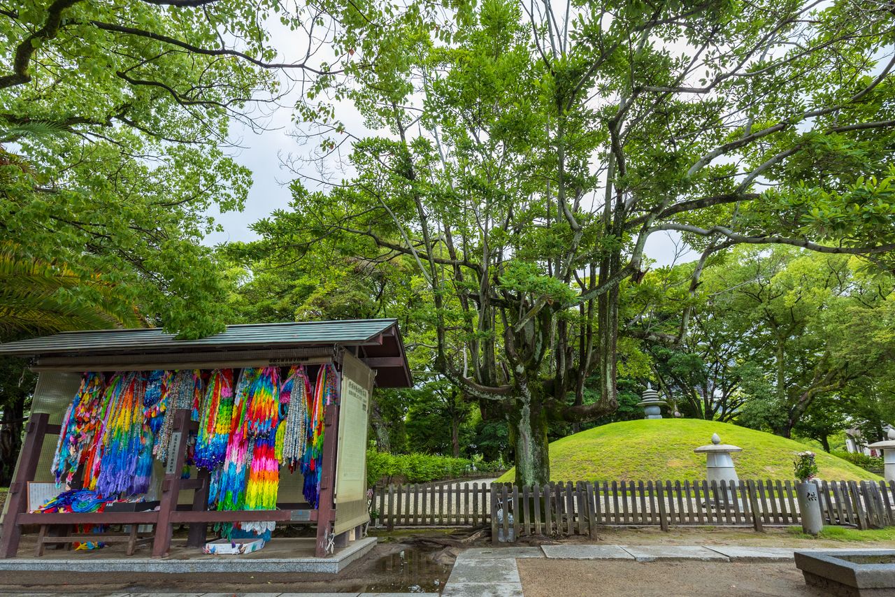 Las grullas de papel (origami) donadas por los visitantes cuelgan frente al montículo funerario. (© nippon.com)