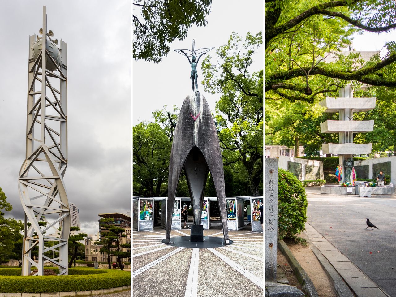 De izquierda a derecha: la Torre Reloj de la Paz, que suena cada mañana a las 8:15; el Monumento a la Paz de los Niños, dedicado a los jóvenes que murieron en el bombardeo y a causa de las enfermedades derivadas de la radiación; y la Torre Conmemorativa a los Estudiantes Movilizados, en recuerdo de los más de 6.000 que perdieron la vida. (© nippon.com)