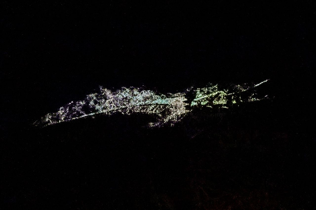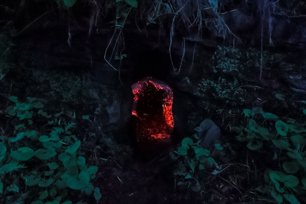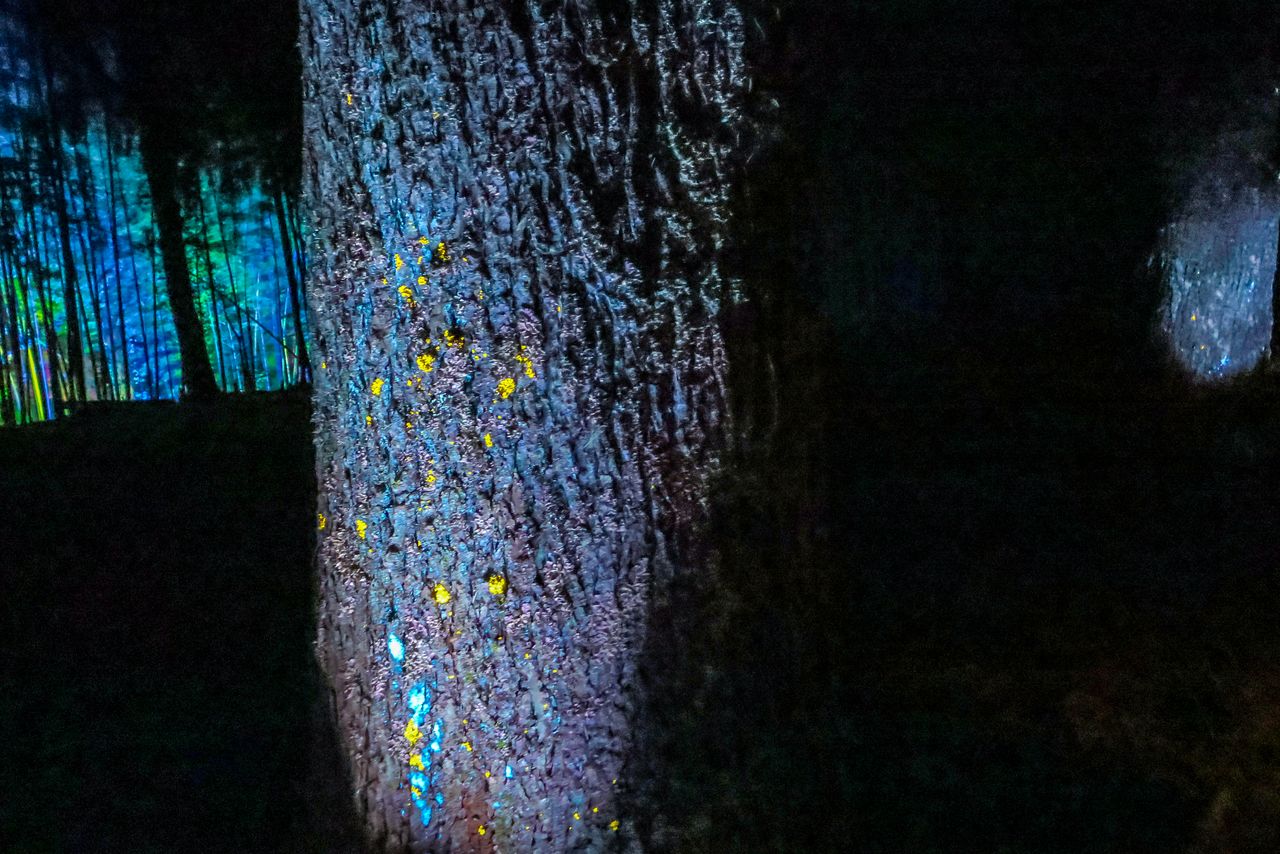 “Cristal de tiempo acumulado”, donde el liquen umenokigoke —una simbiosis de hongos y algas— brilla intensamente en tonos amarillos y azules. (© nippon.com)