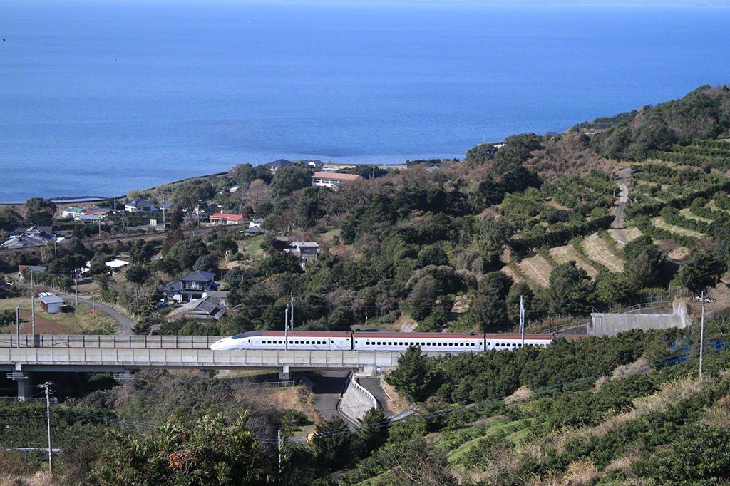 Tren de la Línea Kyūshū Shinkansen bordeando la costa de Amakusa.