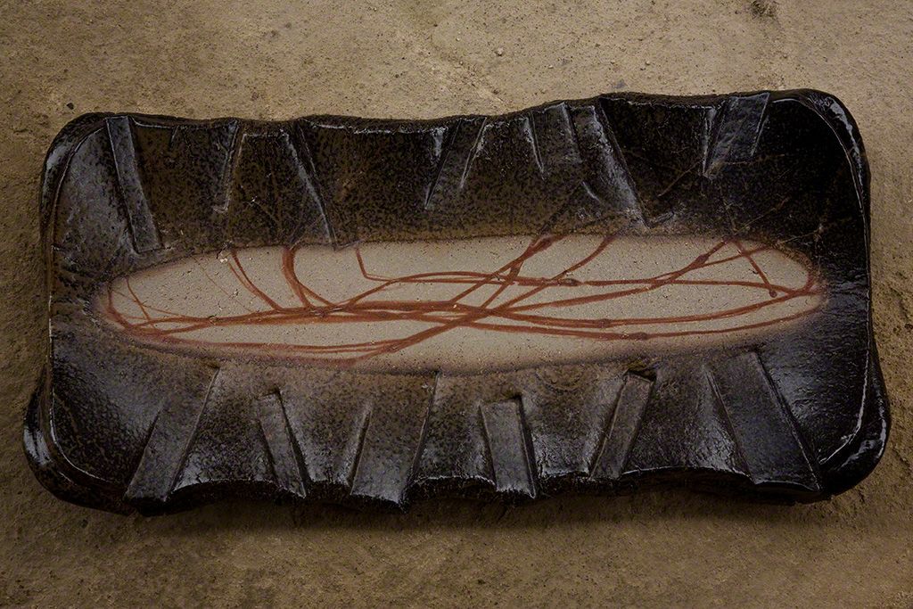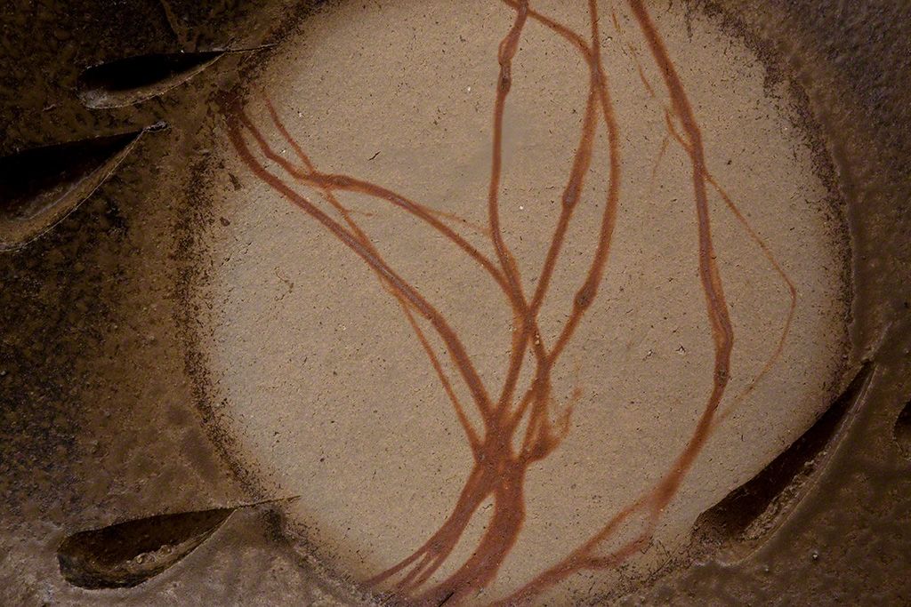 Variación de color provocada por la cocción. Al producirse una reacción química entre la paja y el hierro de la arcilla aparecieron líneas escarlata.