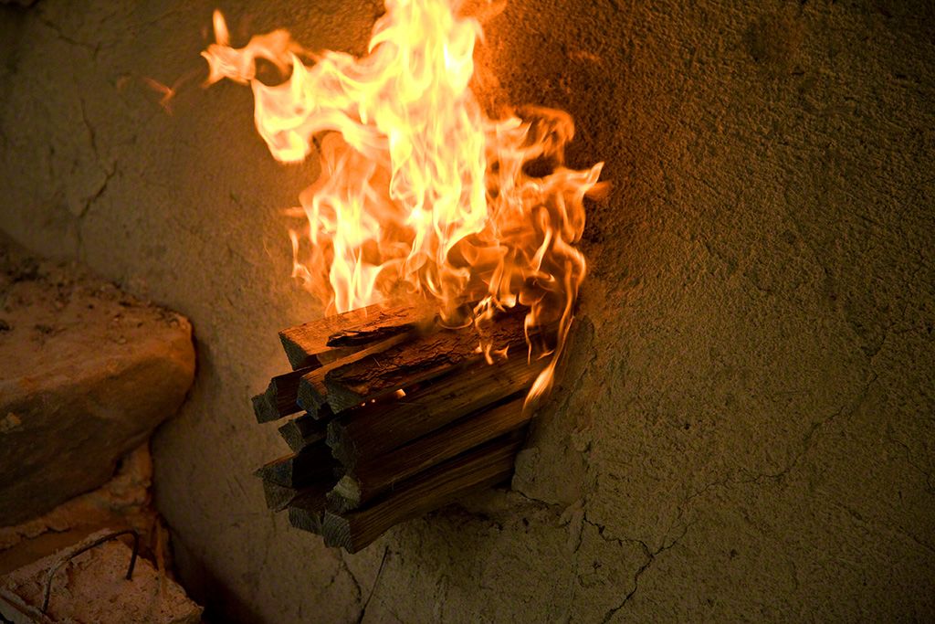 En la parte superior de la boca del horno hay colocadas unas ofrendas para los dioses.