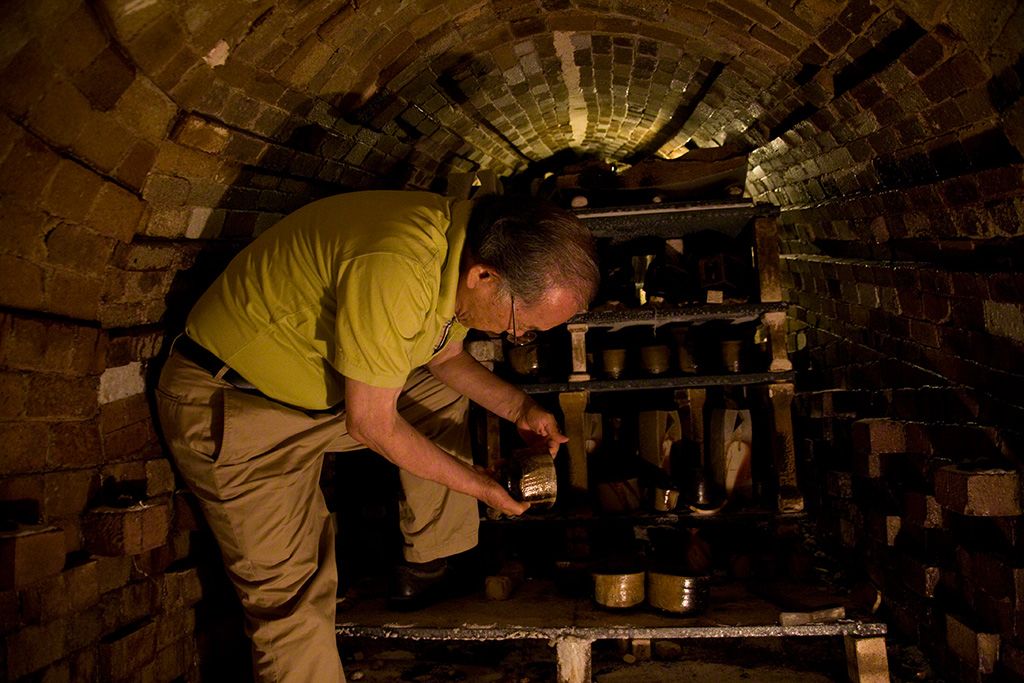 Una vez que se ha enfriado el horno, Isesaki entra para revisar las obras.