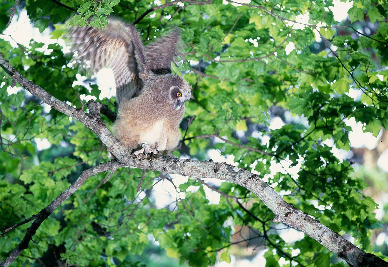 Cuando abandonan el nido, los polluelos de búho manchú todavía no son capaces de volar por el bosque; solo saltan de rama en rama o se lanzan desde lo alto de los árboles para bajar planeando hasta el suelo.