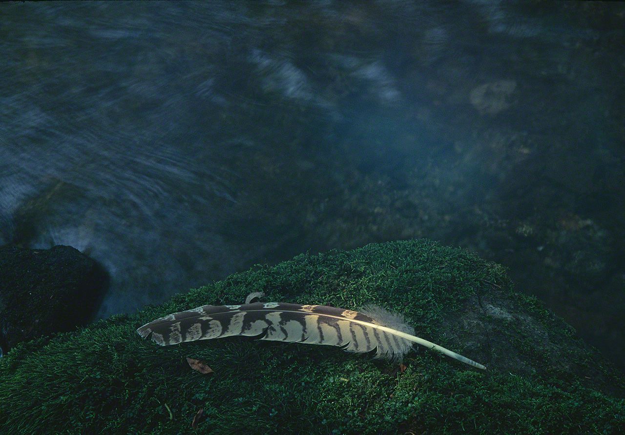 Voy al río donde la noche anterior oí a un búho ululando. Un rayo de sol se cuela entre el follaje iluminando una pluma de búho sobre una roca.