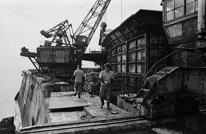 Hombres trabajando en Gunkanjima. La grúa de gran tamaño del fondo fue retirada tras el cierre de la mina.