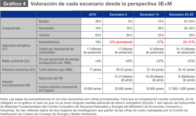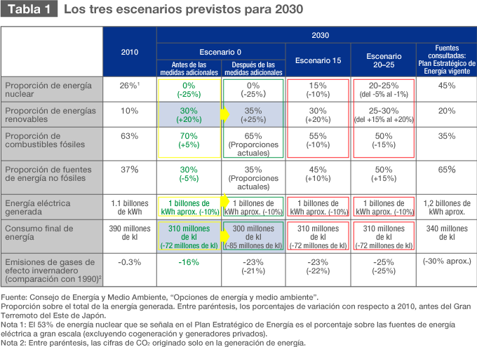 El 29 de junio de 2012, cuando había pasado más de un año desde el accidente en la central nuclear de Fukushima Daiichi, el Consejo Gubernamental de Energía y Medio Ambiente, un órgano que está presidido por el ministro encargado de la Estrategia Estatal, propuso tres posibles escenarios para elaborar un nuevo plan que sustituyera al actual Plan Estratégico de Energía(*1)). En el plan que ha estado en vigor hasta ahora, aprobado en 2010 por el Consejo de Ministros, se indicaba que en 2030 algo más del 50% de la fuerza eléctrica japonesa se obtendría de la energía nuclear(*2), pero con la revisión a la que va a ser sometido, que parte de la premisa de conseguir un ahorro energético próximo al 10%, para ese mismo año se establecen tres opciones o escenarios: excluir la energía nuclear (0%), reducirla al 15% del total, o reducirla hasta que represente entre el 20% y el 25%. En cuanto a la electricidad procedente de energías renovables, para los tres escenarios anteriores (0%, 15%, 20-25%), los porcentajes respectivos serían de 35%, 30% y 25-30%, correspondiendo a la electricidad procedente de combustibles fósiles el 65%, 55% y 50% respectivamente, de forma que el crecimiento de estas dos fuentes (alternativas y combustibles fósiles) sería proporcional a la reducción de la energía nuclear. Las combinaciones a que darían lugar esos tres escenarios quedan recogidas en la Tabla 1.