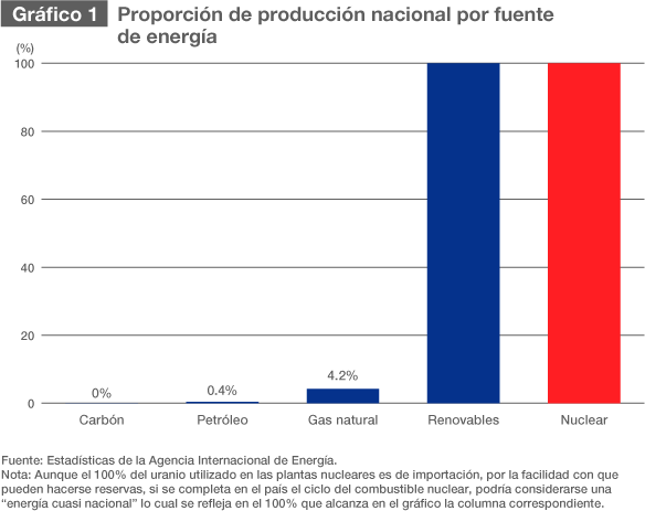 La principal ventaja de las energías renovables es que son recursos completamente nacionales, que contribuyen a elevar la autosuficiencia energética del país (E1). Otro beneficio es que al generarse no se emiten gases de efecto invernadero (E2). Resultan, sin embargo, más costosas que la energía térmica o la nuclear y su densidad energética es menor, por lo que exigen grandes extensiones de terreno, a lo que se suma la gran variabilidad de la potencia generada por los rayos del sol o la fuerza eólica, lo cual representa un problema, pues obliga a adaptar a esos usos la red eléctrica nacional y a tomar otras medidas adicionales.