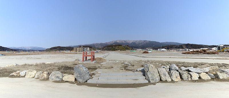 Tras retirar los escombros, la zona que albergaba el centro de Rikuzentakata se ha convertido en un vasto descampado. El monte que se ve a lo lejos en el centro de la imagen es el emplazamiento del antiguo castillo de Takata. La estructura roja que se observa en el plano central son los restos del monumento que se alzaba en la rotonda que había enfrente de la estación de JR de Rikuzentakata.