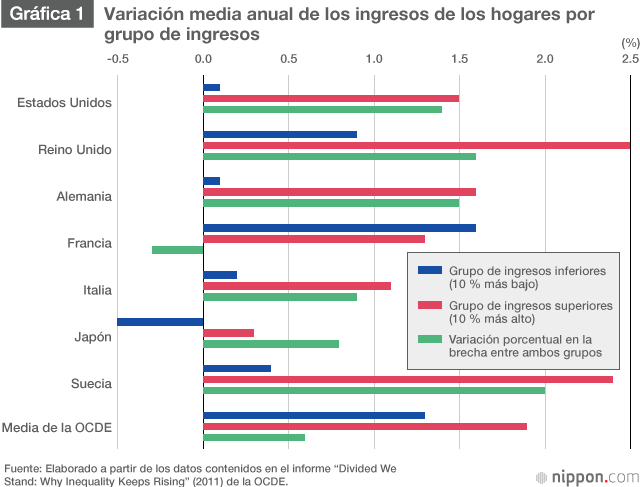 Los países como Francia, donde el índice de crecimiento de las rentas más bajas supera al de las más altas, constituyen la excepción. En la mayoría, se constata que los ingresos crecen mucho más entre los ricos que entre los pobres y que, por tanto, la brecha económica se abre. Aun así, en todos los países, menos en Japón, el promedio de crecimiento de las rentas más bajas es ligeramente positivo. Japón es el único país en el que los ingresos reales de los sectores más pobres de la sociedad dismunuyen, y lo han hecho a un ritmo anual del 0,5 %.