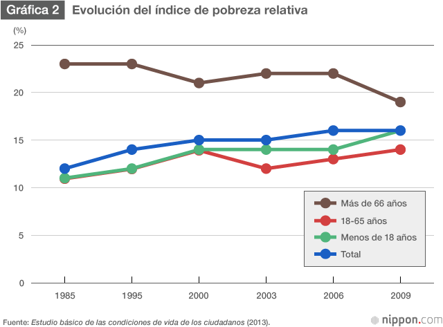 En la gráfica 2, donde se muestra la evolución del índice de pobreza relativa, vemos que el índice del conjunto de la población japonesa tiende a subir, pero que la subida es mucho más rápida en las generaciones más jóvenes. Suele decirse que la subida de este índice es debida principalmente al aumento de la proporción de ancianos, que disponen de menos ingresos, pero el gráfico pone de manifiesto que los factores relacionados con las tendencias demográficas no son los únicos.