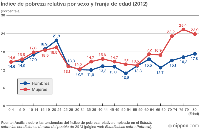 Veamos algunas cifras al respecto. El índice de pobreza relativa representa la proporción de personas cuyos ingresos disponibles se sitúan por debajo del 50 % de la media. Si excluimos las edades más jóvenes, en el caso de las mujeres, dicho índice se encuentra por encima del de los hombres durante casi toda su vida; la brecha aumenta especialmente en los mayores de 65 años. Entre aquellos con 80 años o más, el índice para los hombres es del 17,3 %, mientras que para las mujeres llega al 23,9 %, un alza de casi siete puntos(*4).