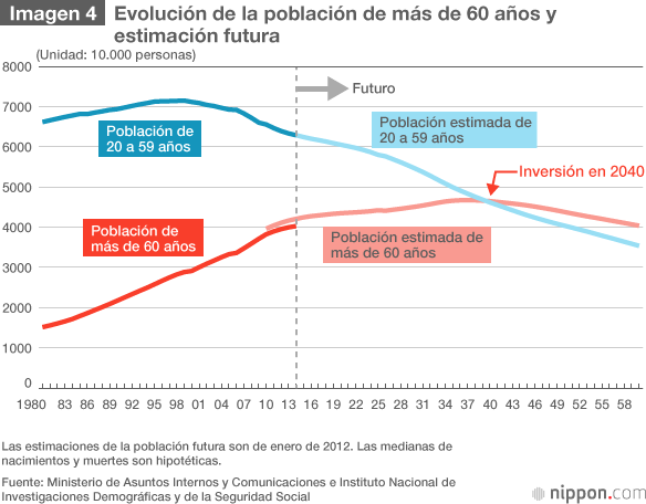 En los tiempos venideros la población anciana dejará de expandirse y las generaciones trabajadoras irán decreciendo de forma acelerada (imagen 4). Algunos expertos afirman que la solución es aumentar la población inmigrante. Sin embargo, solo en el quinquenio de 2015 a 2020 la población japonesa ya perderá 400.000 – 600.000 personas al año, y compensar esa pérdida con población inmigrante resulta técnicamente imposible. Por otro lado, sería una barbaridad pedir a la población mayor, inquieta por su porvenir, que gastase sus ahorros para impulsar el consumo y contribuir al futuro de la economía japonesa.