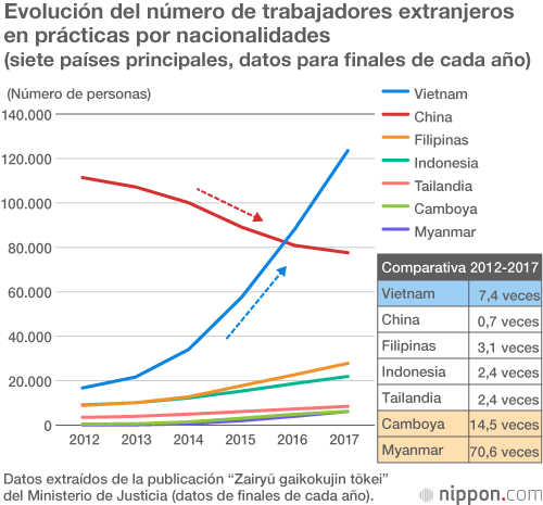 El principal país de procedencia de estos trabajadores en prácticas venía siendo China, pero a consecuencia del desarrollo económico experimentado, de la reducción del número de hijos y del envejecimiento poblacional, en los últimos años este flujo de chinos se ha reducido (véase el diagrama 4) y a partir de 2016 su lugar está siendo ocupado con gran rapidez por los vietnamitas, que son ya el grupo nacional más numeroso.