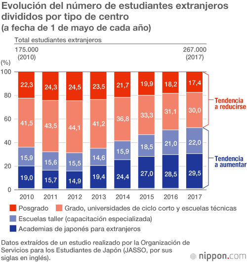 En cuanto a la proporción de estudiantes extranjeros que realizan algún trabajo en Japón, si bien la de los universitarios (grado y posgrado) ha bajado en los últimos años, la de los alumnos de escuelas profesionales y academias de japonés está subiendo. Según un informe de la Organización de Servicios para los Estudiantes de Japón (JASSO, por sus siglas en inglés), en la mayor parte de los casos estos estudiantes son empleados en los restaurantes, konbini (convenience stores, minisupermercados de 24 horas) y en otros comercios.