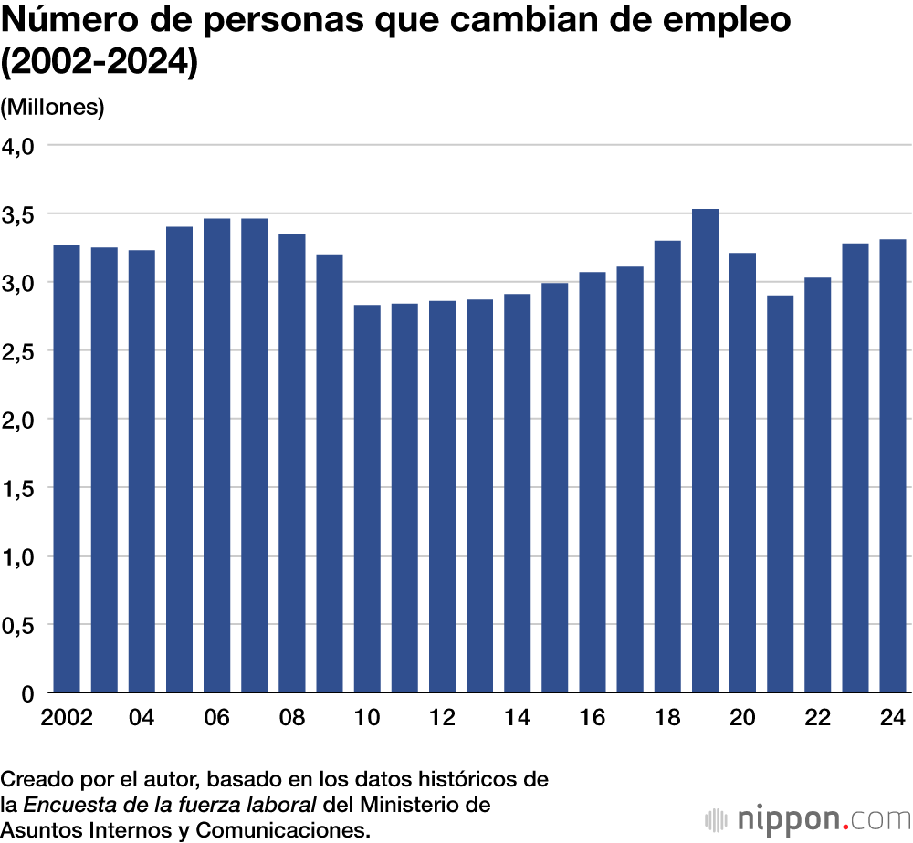 Los datos de la Encuesta de la Fuerza Laboral, realizada mensualmente por el Ministerio de Asuntos Internos y Comunicaciones, indican que el número de personas que cambian de trabajo —definidas como aquellas con experiencia laboral que dejaron su empresa anterior en el último año— alcanzó los 3,53 millones en 2019. Esta cifra disminuyó durante la pandemia de la COVID-19, pero volvió a crecer tras tocar fondo en 2021. Se observó una tendencia similar durante la crisis financiera mundial de 2008-2009, lo que indica que las transiciones laborales son sensibles a las condiciones económicas.