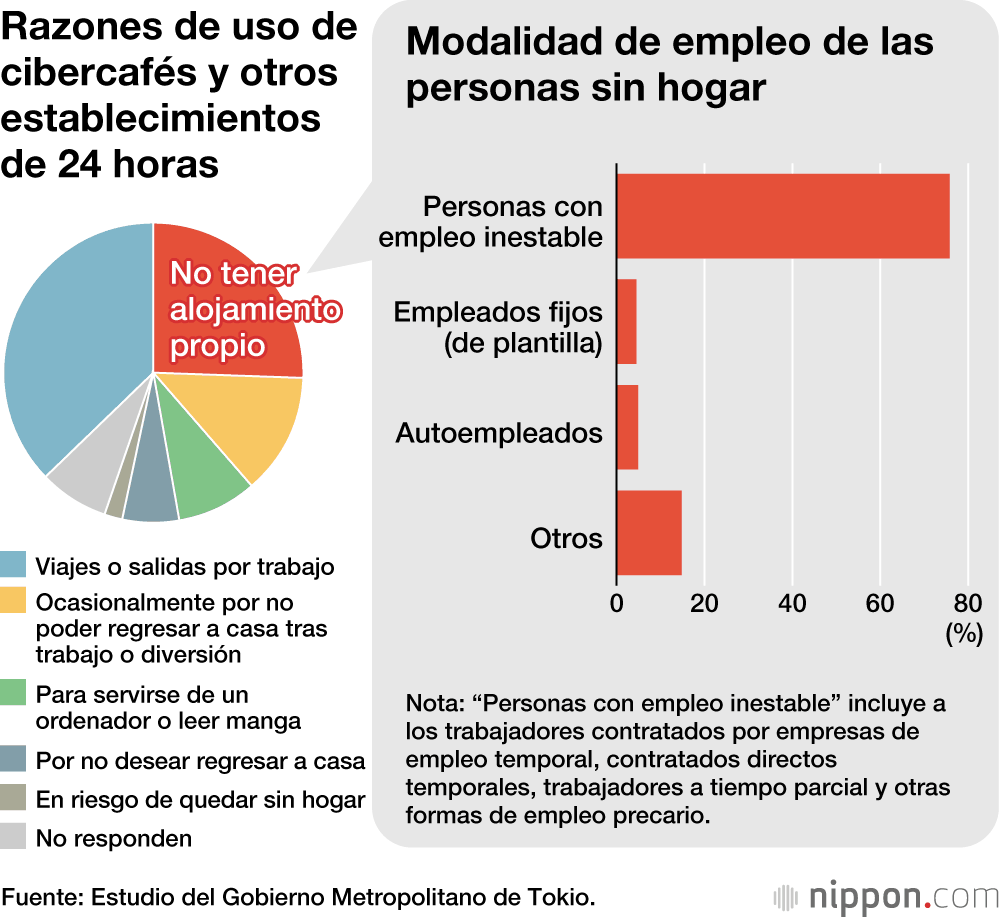 Los llamados “refugiados de los cibercafés” son trabajadores de bajos ingresos, contratados por un solo día o a través de agencias de trabajo temporal, que pasan las noches en estos establecimientos abiertos las 24 horas del día mediante el pago de una tarifa que ronda los 2.000 yenes. Se estima que en Tokio viven de este modo cerca de 4.000 personas. Como medida de socorro para los afectados por el cierre de estos cafés, el Gobierno metropolitano ha habilitado algunos business-hotels (hoteles semiautomatizados con servicios básicos) en los que, según cifras oficiales, se alojan ahora unas 1.200 personas.