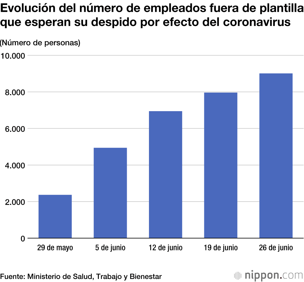 Según un estudio del Ministro de Salud, Trabajo y Bienestar, a fecha de 26 de junio un total de 9.009 empleados fuera de plantilla esperaba su despido debido a los efectos del coronavirus.
