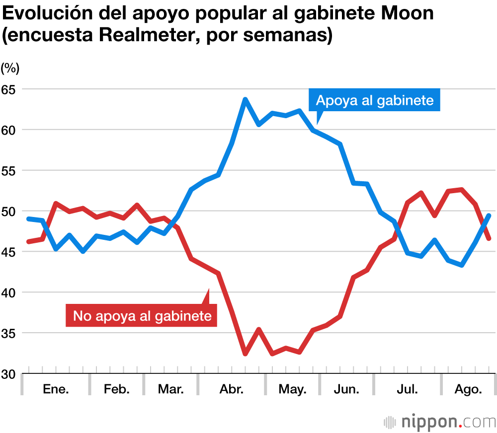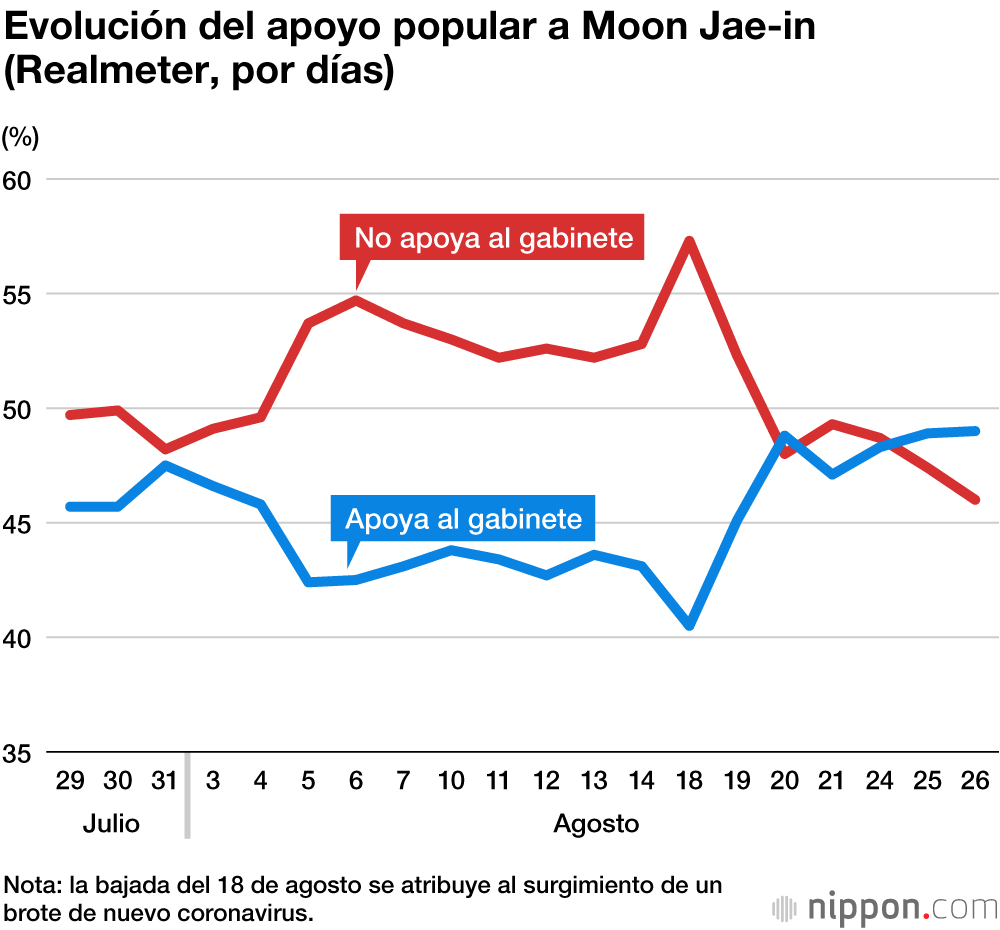 En Corea del Sur, aproximadamente hasta 2012, era evidente la relación entre las alzas y bajas del apoyo popular al presidente y al partido gobernante, y las declaraciones y actuaciones políticas respecto a Japón, partieran del propio presidente o de su equipo. Sin embargo, dicha relación se hizo cada vez más tenue durante el mandato de Park Geun-hye y hoy en día, con el presidente Moon, ya no se aprecia interrelación entre la política que sigue frente a Japón y el apoyo que obtiene. Esto se refleja también en la encuesta que realiza semanalmente Gallop-Corea del Sur, en la que la política frente a Japón ya apenas aparece entre las razones que llevan a los surcoreanos a prestar apoyo al Gobierno o a negárselo. Este agosto hemos visto también que lo que los dirigentes con más peso en el ejecutivo han dicho sobre el tema de las relaciones con Japón ha tenido escaso efecto sobre el porcentaje de apoyo al Gobierno.