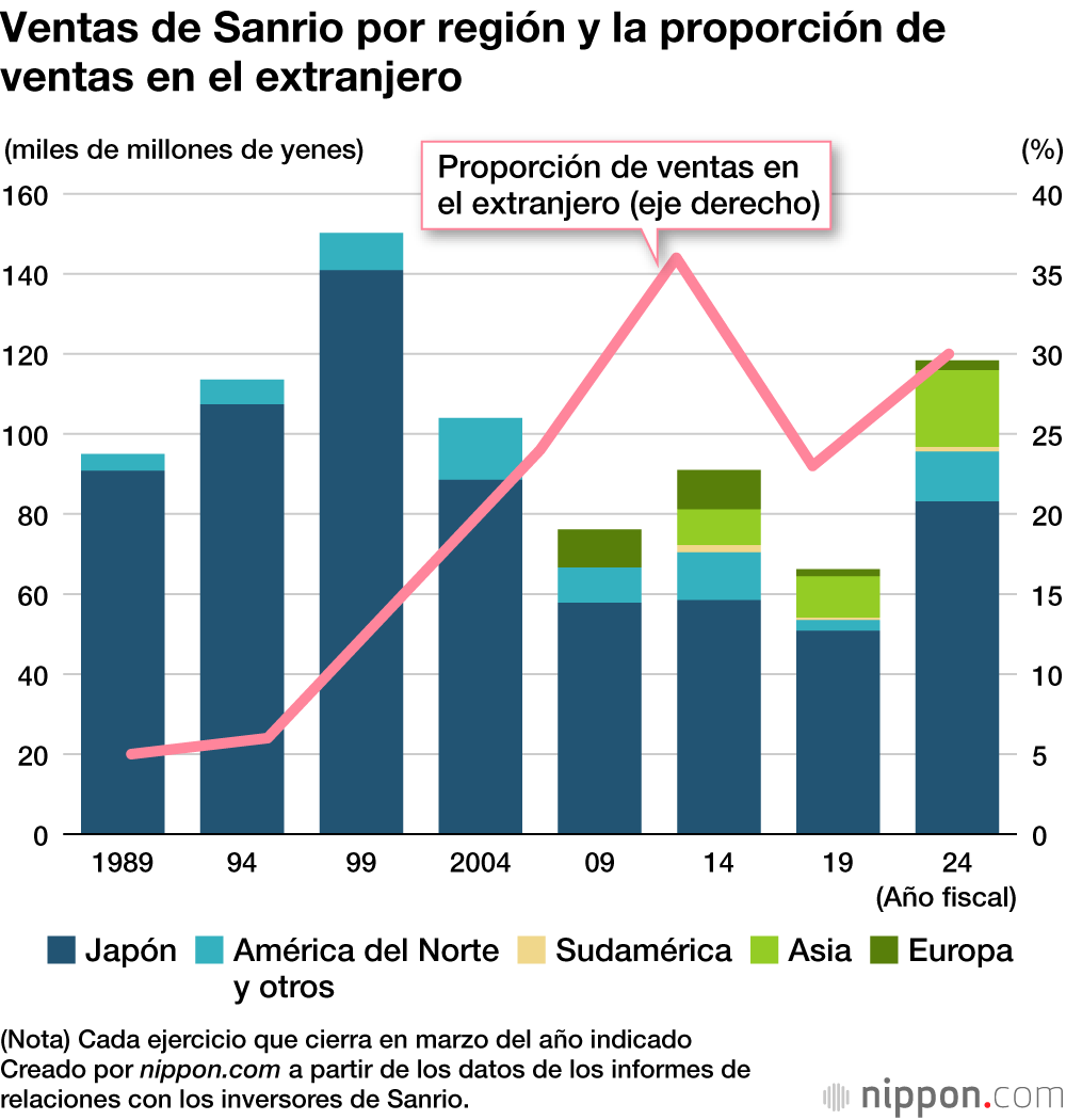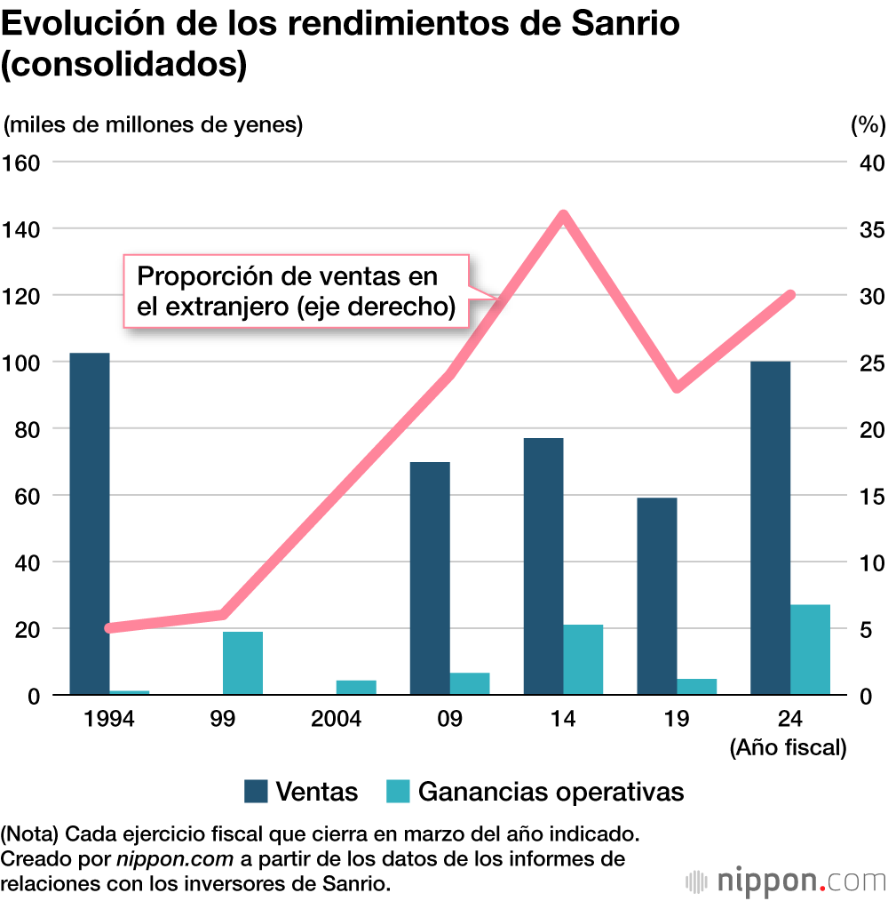 En la actualidad, Sanrio tiene negocios en más de 130 países y regiones del mundo. Desglosadas por regiones, las ventas en el extranjero superaron los 10.000 millones de yenes en el ejercicio fiscal que cerró en marzo de 2004, que correspondía al 30.º aniversario de Hello Kitty. Una década después, en 2014, la cifra superó los 30.000 millones de yenes y la proporción de ventas en el extranjero fue de más del 30 %.