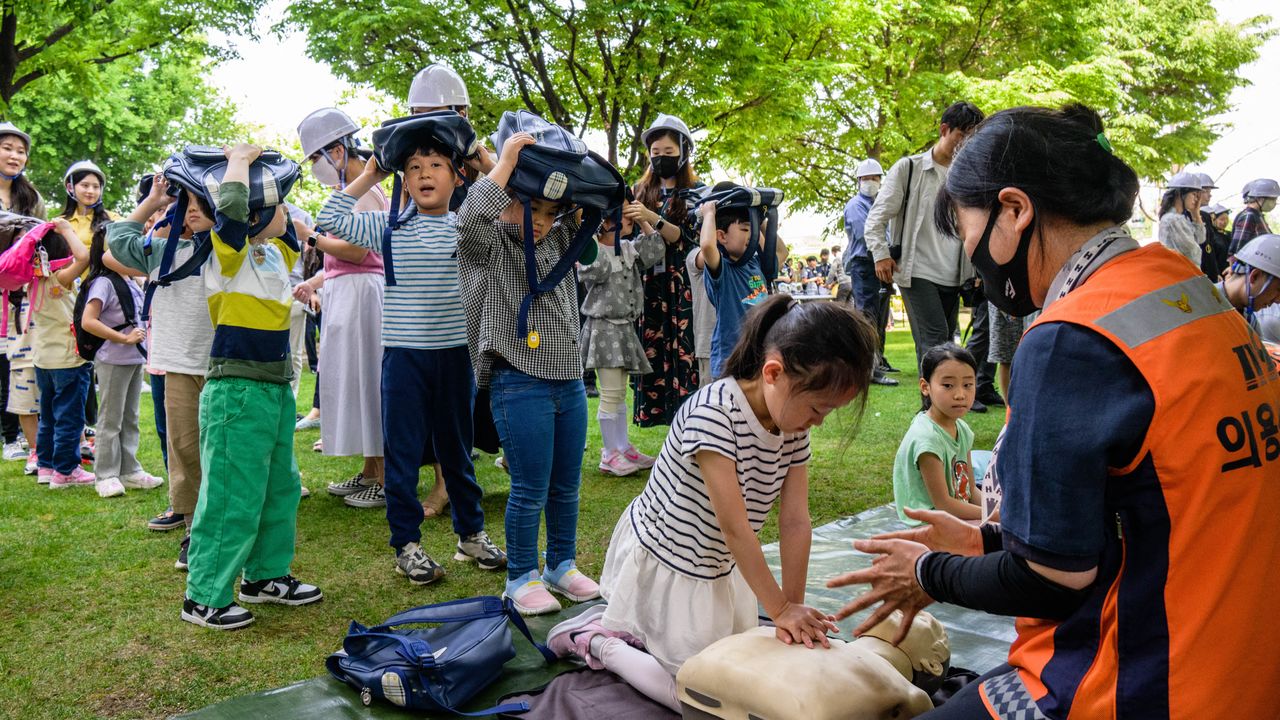 (Artículo publicado originalmente en japonés, y traducido al español de la versión en inglés. Imagen del encabezado: clase de primeros auxilios para niños durante un simulacro de defensa civil celebrado en el centro de Seúl, mayo de 2023 - © AFP/Jiji.)