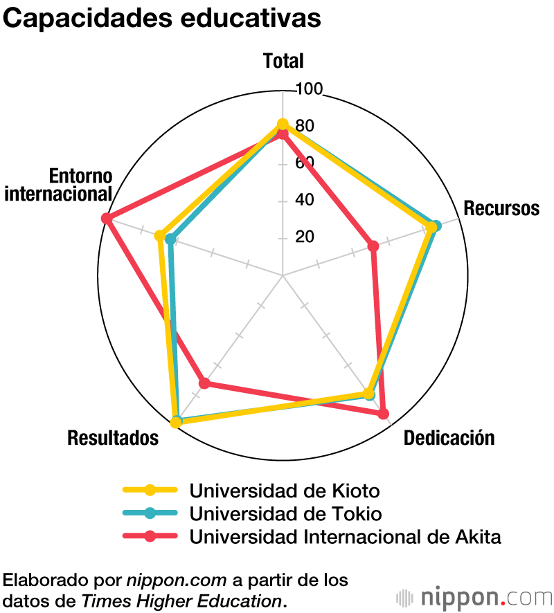 Times Higher Education utilizó cuatro categorías principales para su clasificación. La Universidad de Tokio quedó en primer lugar en el apartado de los “recursos”, en el que se incluye la financiación y número de profesores por estudiante en cada facultad, mientras que la Universidad de Kioto fue primera en “resultados”, que valora el prestigio académico y la reputación entre los empleadores. No obstante, la Universidad Internacional de Akita, una institución pública, fue la mejor universidad en materia de “dedicación”, basándose en parte en el desarrollo de sus talentos globales y de las aptitudes de los estudiantes, y en el apartado de “entorno internacional”, que incluye factores como la proporción de personal y estudiantes extranjeros.