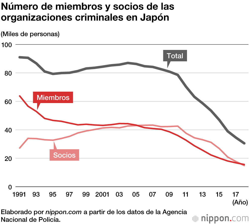 A finales de 2018 las bandas organizadas conocidas como bōryokudan en Japón contaban con 15.600 miembros, lo que supone 1.200 personas menos que en el año anterior. En los últimos 15 años esta cifra se ha ido reduciendo de forma constante. También ha decrecido el número de los llamados “socios” en los últimos ocho años y en la actualidad se calcula que hay unos 14.900. Ambas cifras son las más bajas que se han registrado desde que comenzasen a reunirse estos datos en 1958.