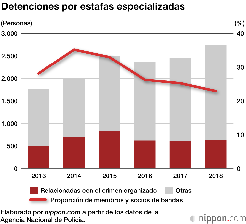 Entre las personas arrestadas por estafa, 630 fueron delincuentes especializados en el timo conocido como ore ore sagi (una estafa telefónica que se traduce literalmente como “la estafa del soy yo, soy yo”) y las facturaciones falsas. Aunque el número de integrantes y de socios de este tipo de organizaciones involucradas en estafas especializadas se ha ido reduciendo desde 2015, en 2018 fueron 2.747 de todos los arrestados ese año, es decir, el 22,9 % del total, una proporción mucho más alta que el 6,3 % del número de miembros de bandas criminales respecto a la cifra total de infractores del código penal.