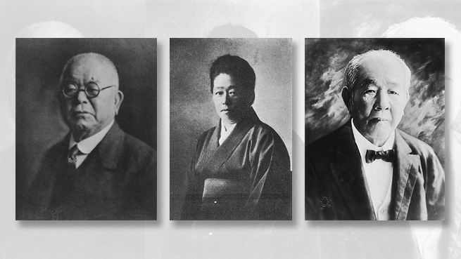 Fotografía del encabezado: desde la izquierda, Kitasato Shibasaburō, Tsuda Umeko y Shibusawa Eiichi. (Colección digital de la Biblioteca de la Dieta Nacional.)