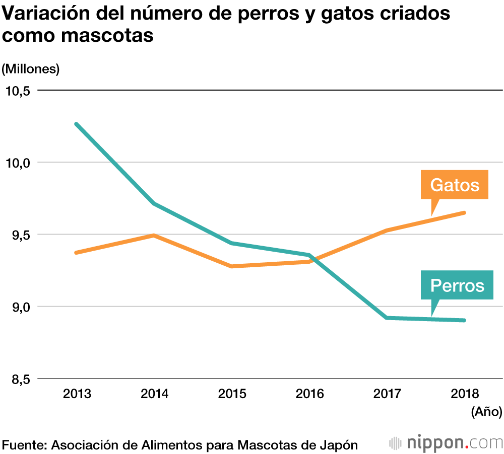 Según una encuesta nacional sobre gatos y perros cuidados como mascotas, realizada anualmente por la Asociación de Alimentos para Mascotas de Japón, el número total de perros en 2018 fue de 8.903.000, y el de gatos 9.649.000. Continuando la tendencia del año anterior, los gatos han sobrepasado a los perros. En los últimos años la cifra de perros ha disminuido, mientras que la de los gatos está aumentando gradualmente.