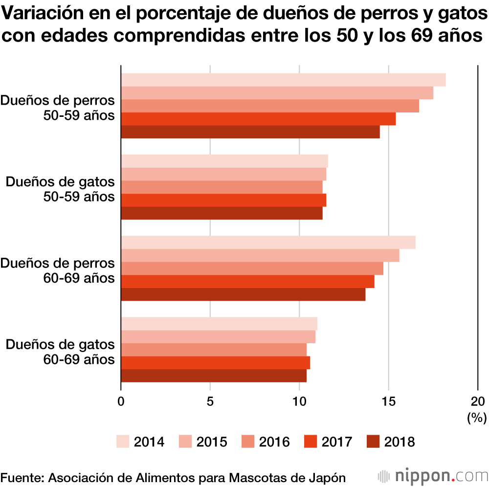 Si bien ha habido pocos cambios interanuales en la edad de los dueños de los gatos, la proporción de dueños de perros en su cincuentena y sesentena ha ido disminuyendo paulatinamente. Aproximadamente el 90 % de los gatos y perros se cuidan dentro del hogar; sin embargo, como los perros necesitan salir a pasear, esto se está convirtiendo en una carga para los propietarios de mediana edad y mayores.