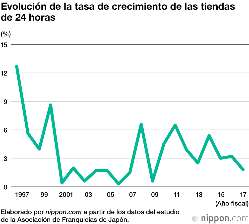 El crecimiento de las ventas de las tiendas de 24 horas (konbini) está empezando a ralentizarse en un mercado extremadamente saturado. Un estudio de la Asociación de Franquicias de Japón reveló que las ventas totales de todas las tiendas de 24 horas del país solo aumentaron un 2,7 % en abril de 2019 en comparación con el mismo mes de 2018, y tan solo un 1,3 % entre las tiendas que ya estaban en funcionamiento hace un año. La tasa de crecimiento continúa presentando subidas y bajadas, alcanzando hasta un 9,6 % interanual en enero de 2009, aunque en general se ha venido reduciendo desde 2015.