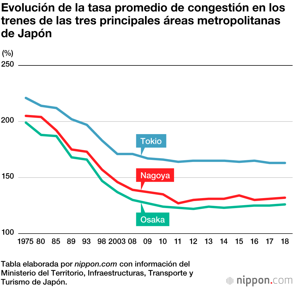 Según el informe del Ministerio del Territorio, Infraestructuras, Transporte y Turismo de Japón sobre el nivel de aglomeración en las principales líneas ferroviarias del país para el año fiscal 2018, 11 líneas de la zona metropolitana de Tokio superaron la tasa de congestión de 180 %, la meta establecida para las horas punta. Los resultados revelan que la línea Tōzai, del Metro de Tokio, tiene la mayor tasa de congestión, con un 199 %. Esto es, casi el 200 %, una situación definida como “las personas entran en contacto físico y se siente una considerable presión”.