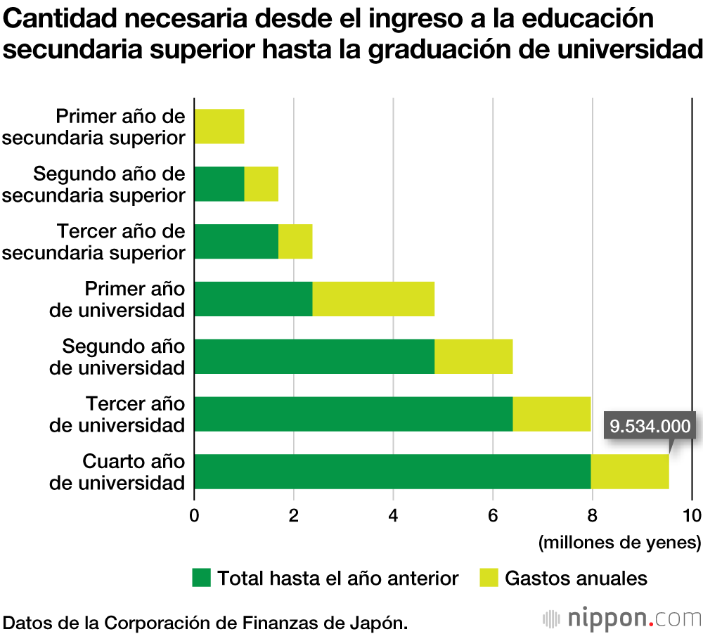 Anualmente, cada hijo representa un gasto escolar anual de 685.000 yenes si está en secundaria superior, y de 1.569.000 yenes si está en la universidad. Esto incluye gastos como matrícula, transporte, materiales escolares y clases preparatorias. Sin embargo, también hay que añadir otros 319.000 yenes para un hijo en primer año de secundaria superior y 884.000 para un hijo que ingresa a la universidad, por gastos como el examen de admisión, la inscripción y los pagos a instituciones no elegidas.