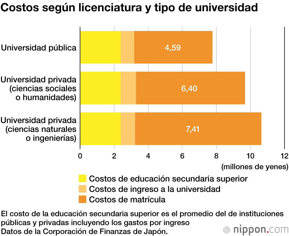Por otra parte, dependiendo del tipo de universidad y la licenciatura que se elija, se necesitarán 7.767.000 yenes si se ingresa a una universidad pública y, en el caso de las privadas, 9.682.000 si se trata de alguna carrera de humanidades y ciencias sociales y 10.641.000 yenes si es alguna carrera de ciencias naturales o ingeniería. En otras palabras, hay una diferencia de entre dos y tres millones de yenes dependiendo de si la universidad en la que se matricula es pública o privada.