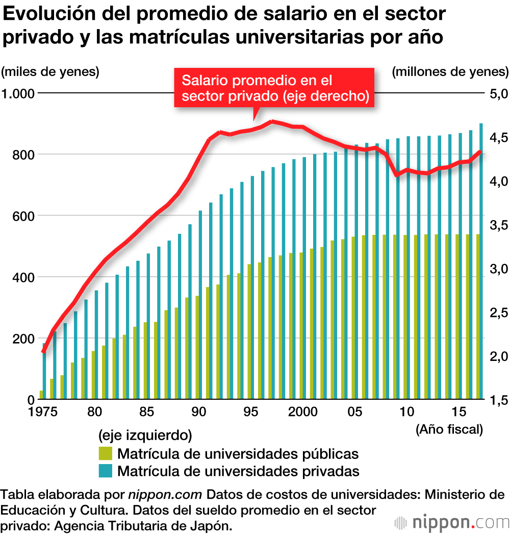 La generación de los padres de los ahora universitarios asistió a la universidad en el momento pico de la burbuja económica de Japón. Según las estadísticas históricas del Ministerio de Educación y Cultura, en 1989, la matrícula anual en una universidad privada era de 570.584 yenes y, en 2017, de 900.093, esto es, un incremento de 330.000 yenes. En contraste, el salario promedio en el sector privado alcanzó su máximo en 1997 y ha ido disminuyendo desde entonces. En 2009 tocó fondo y ahora, por fin, ha recuperado el nivel que tenía antes de la crisis de Lehman Brothers. Por lo tanto, los gastos escolares se han convertido en una mayor carga para las familias.