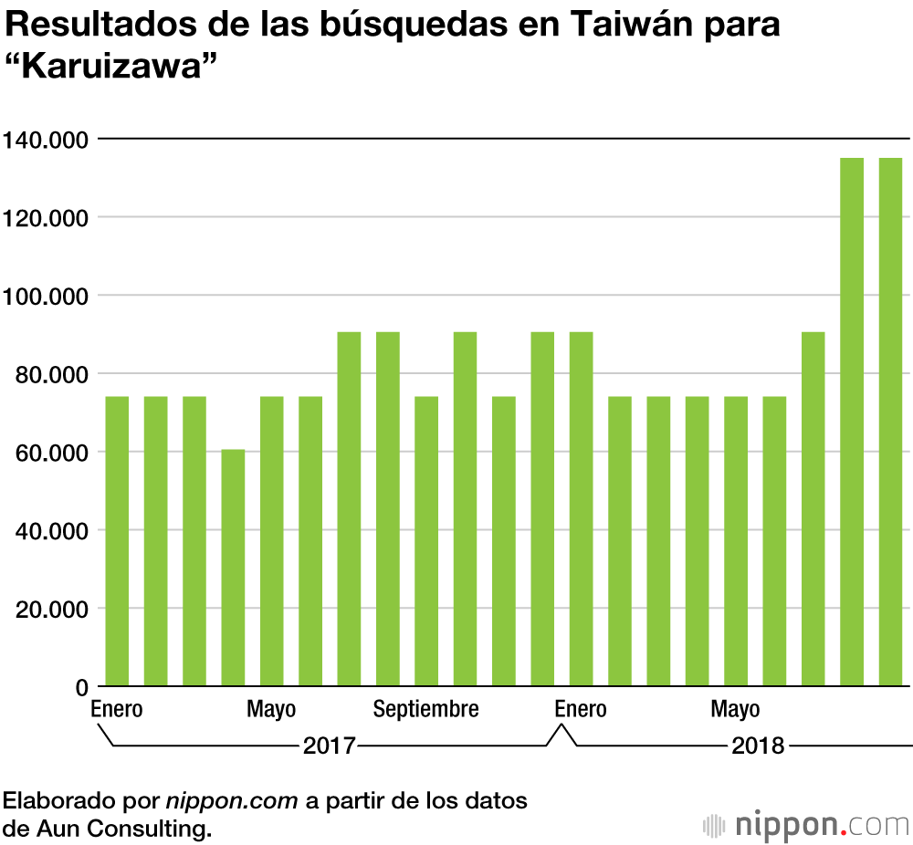Cada vez más personas que tienen planeado viajar a Japón buscan por internet la expresión “hoteles de montaña en Karuizawa”. Los análisis realizados por la empresa situada en Tokio Aun Consulting, centrados en los resultados de las búsquedas por internet de destinos en Japón en 13 países o regiones, revelan que en septiembre de 2018 “Karuizawa” fue el enclave más buscado en Taiwán y el número dos en Hong Kong. Esta localidad de la prefectura de Nagano se situó también entre los 20 principales resultados de búsquedas en el Reino Unido, Indonesia, Malasia, Singapur, los Estados Unidos y Vietnam. Además de tratarse de un lugar accesible, a solo una hora y media de viaje en Shinkansen desde Tokio, entre los encantos de Karuizawa está su singular belleza paisajística durante las cuatro estaciones, así como sus centros comerciales y otras zonas de para realizar compras.