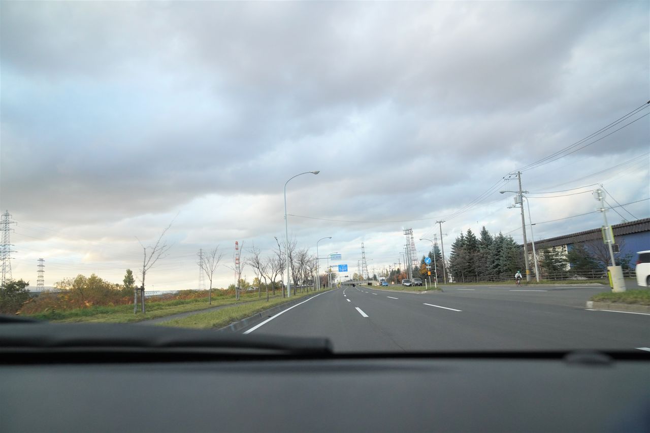 La mayor dificultad en el maratón de Hokkaidō es Shinkawa-dōri porque no tiene edificios ni árboles que tapen el sol. La fotografía se tomó desde el interior de un coche, por lo que se ve la guantera en primer plano.