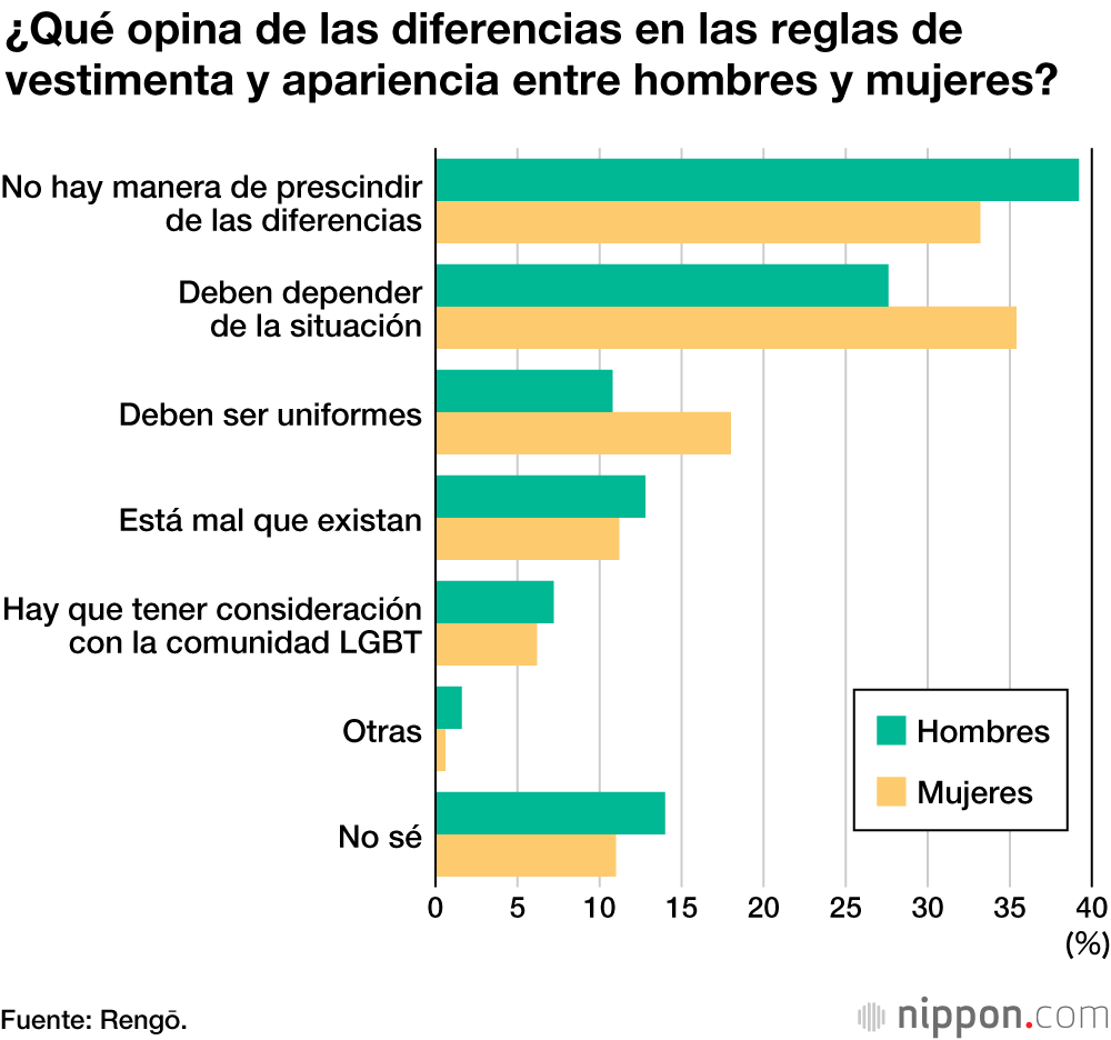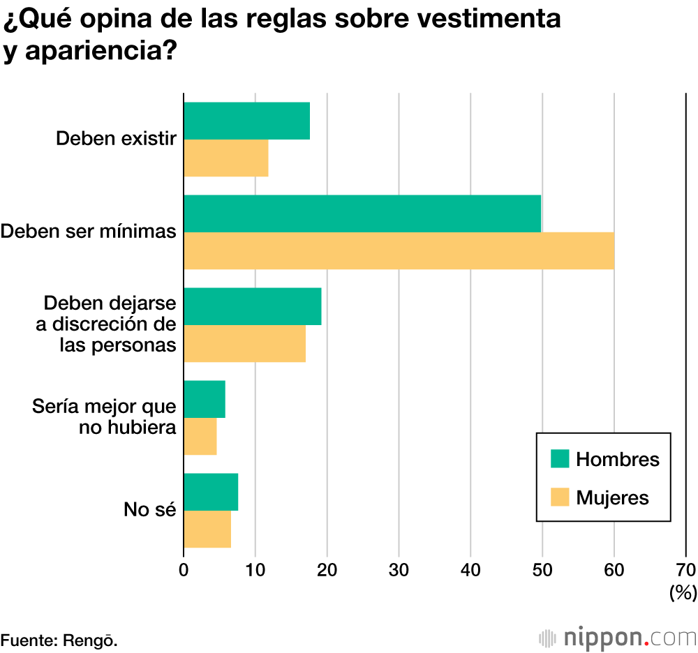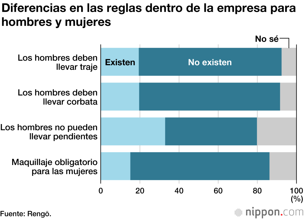 Según una encuesta de la Federación de Sindicatos de Japón (Rengō) sobre las diferentes reglas que existen en las empresas para los hombres y las mujeres, el 57,1 % de las personas respondió que en sus lugares de trabajo existen normas sobre la apariencia y la vestimenta. Entre los que contestaron que existen diferencias en las reglas para los hombres y las mujeres, el 22,6 % dijo que se trataba de normas sobre la vestimenta, el 9,1 % sobre los colores de la ropa y el 16,8 % sobre los zapatos.
