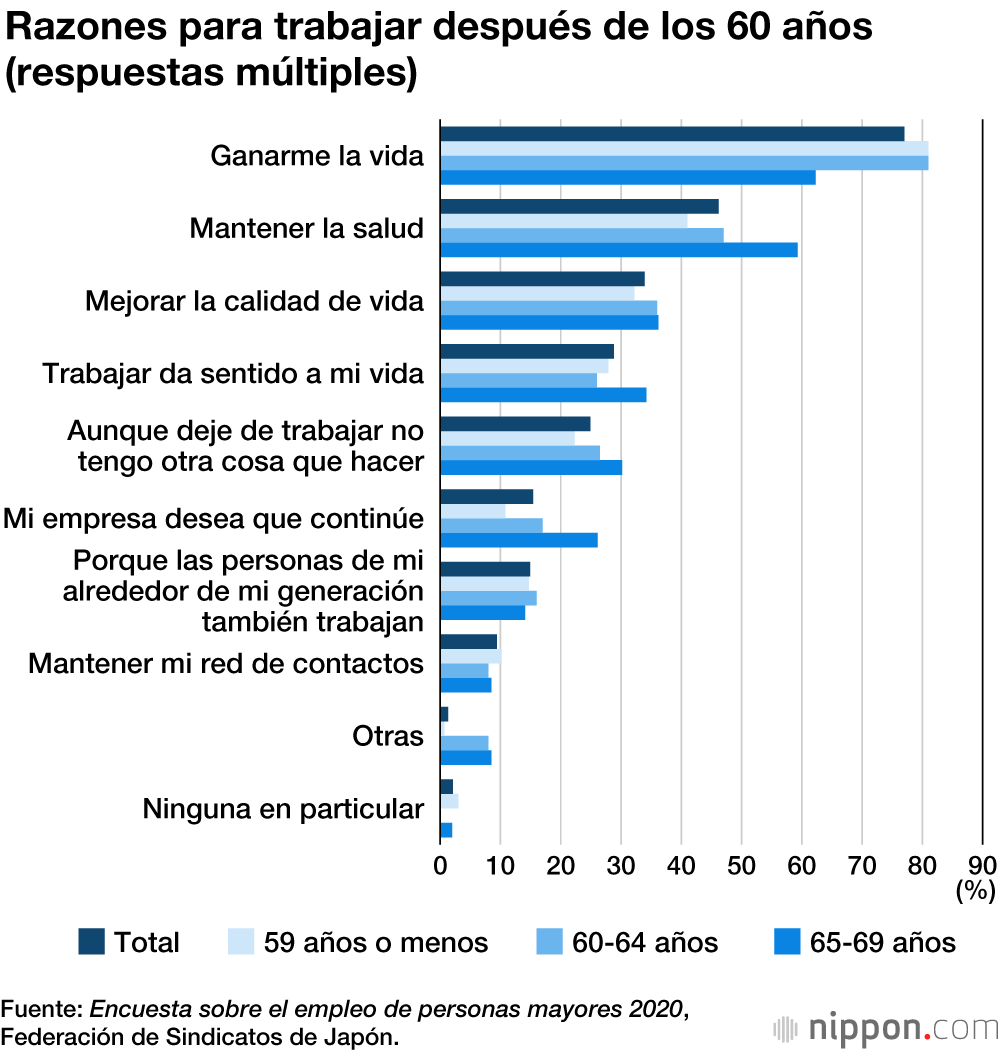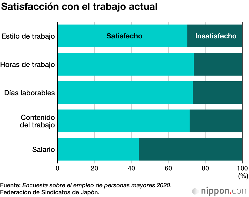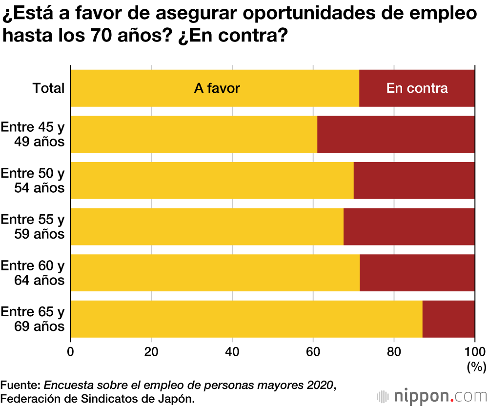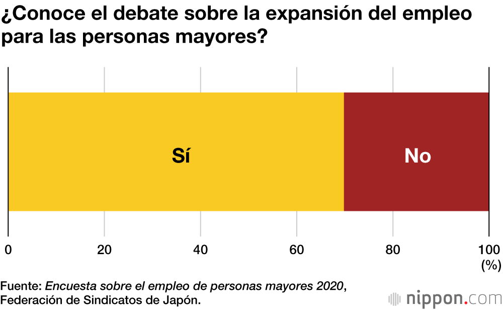 En una encuesta realizada en diciembre de 2019 por la Federación Japonesa de Sindicatos, el 69,8 % de los participantes sabía que el Gobierno está discutiendo la expansión del empleo de las personas mayores. Cuando se les preguntó su opinión sobre la promoción de medidas para asegurar oportunidades de empleo hasta la edad de 70 años, el 71,4 % se mostró de acuerdo. Un porcentaje particularmente alto fue el de los encuestados de entre 65 y 69 años, que estaban a punto de cumplir los 70 años, con un 87 % a favor.