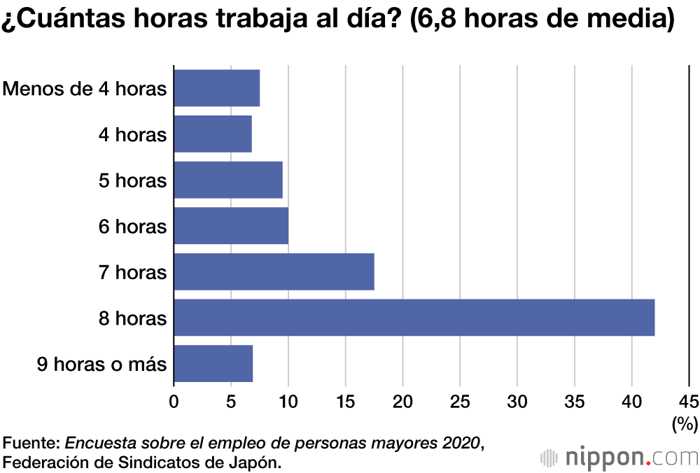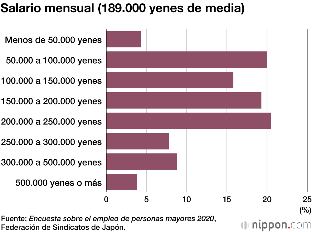 Hoy, cuando preguntamos sobre las condiciones de trabajo reales de quienes trabajan a la edad de 60 años o más, lo más común es que se trabajen 8 horas al día y cinco días a la semana. El rango más común del salario mensual va desde 50.000 a 250.000 yenes, y la media es de 189.000 yenes. Por modalidad de empleo, el sueldo de los empleados con contrato fijo fue de 331.000 yenes, mientras que el de los empleados no regulares fue de 130.000 yenes, más del doble de diferencia.