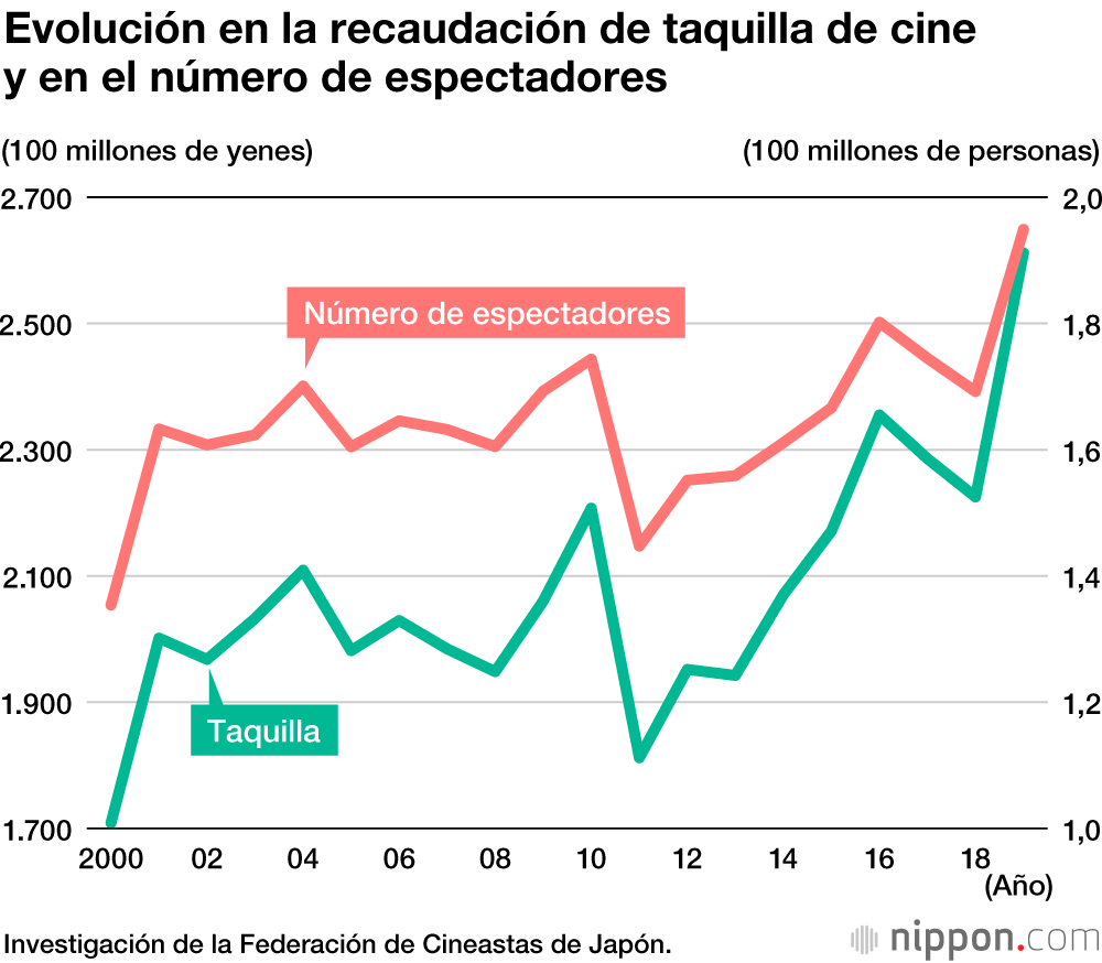 Según un anuncio de la Federación de Cineastas de Japón, creada por un grupo de grandes compañías de distribución de películas, la recaudación en taquilla en 2019 fue de 261.180 millones de yenes. Esta cifra aumentó un 17 % respecto al año anterior y es la más alta desde el año 2000, cuando las estadísticas adoptaron el formato público actual. El número de espectadores fue de 194,91 millones, y la tarifa de entrada promedio por espectador fue de 1.340 yenes. Ambas cifras han sido las más altas desde el año 2000.