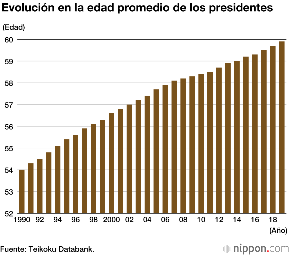De acuerdo con el estudio Análisis de la edad de los presidentes a nivel nacional (2020), que realiza Teikoku Databank cada año, la edad promedio de los presidentes ha subido 0,2 años respecto al año anterior llegando a ser de 59,9 años de edad, un nuevo récord histórico. El porcentaje por franja de edad más alto se da en el grupo de 60 a 69 años con un 28,1 %. En el grupo entre 50 y 59 años es del 26,4 % y para el grupo entre 70 y 79 años es del 19,7 %. Si se limita a los presidentes de las empresas cotizadas en la bolsa, la edad media es de 58,7 años, 0,2 años menos que el año anterior.